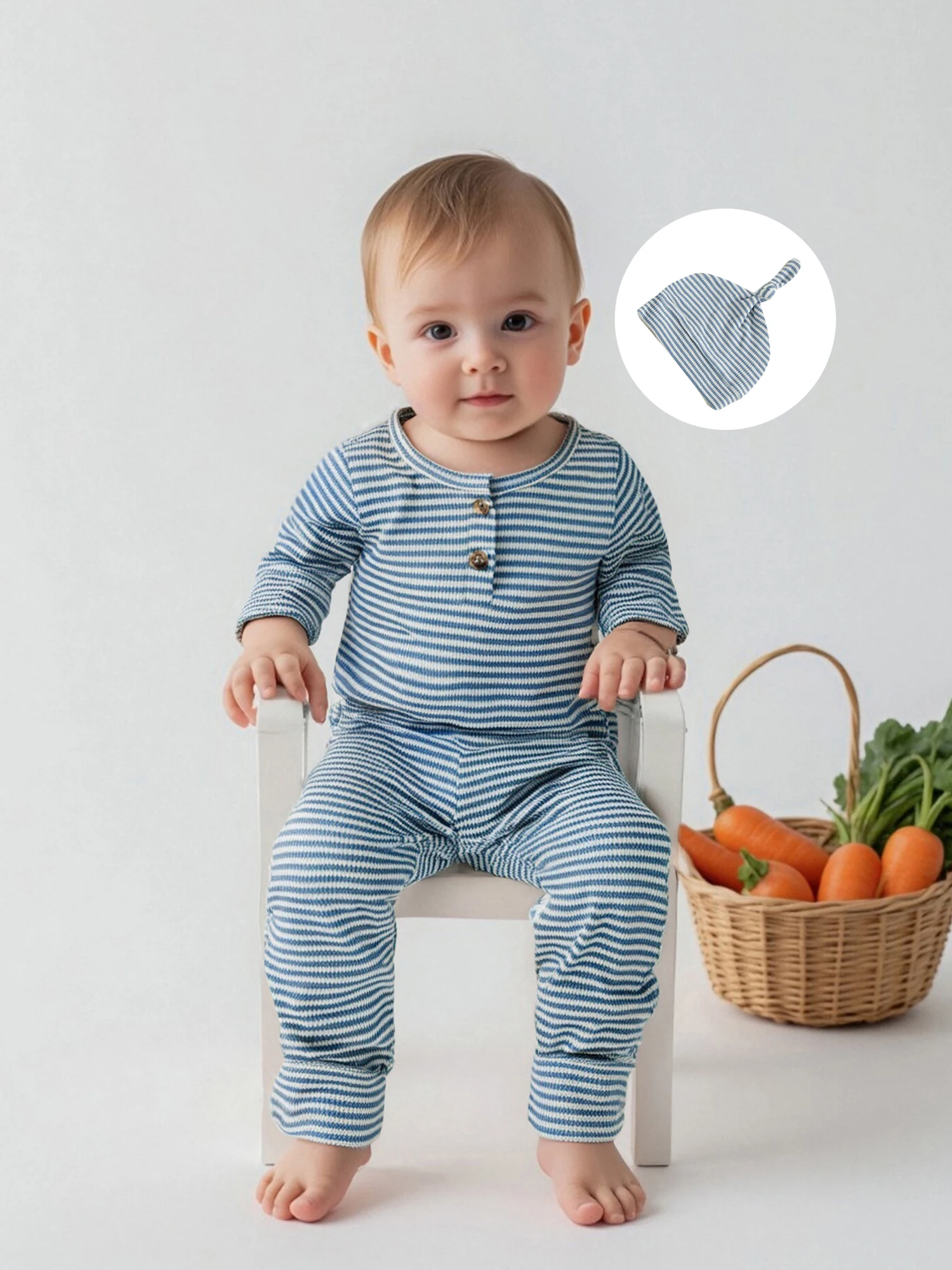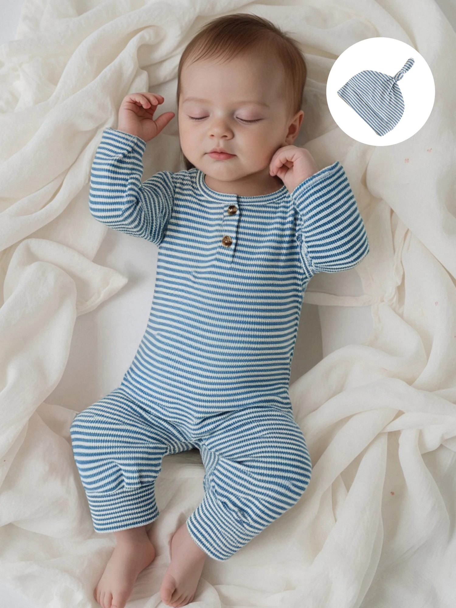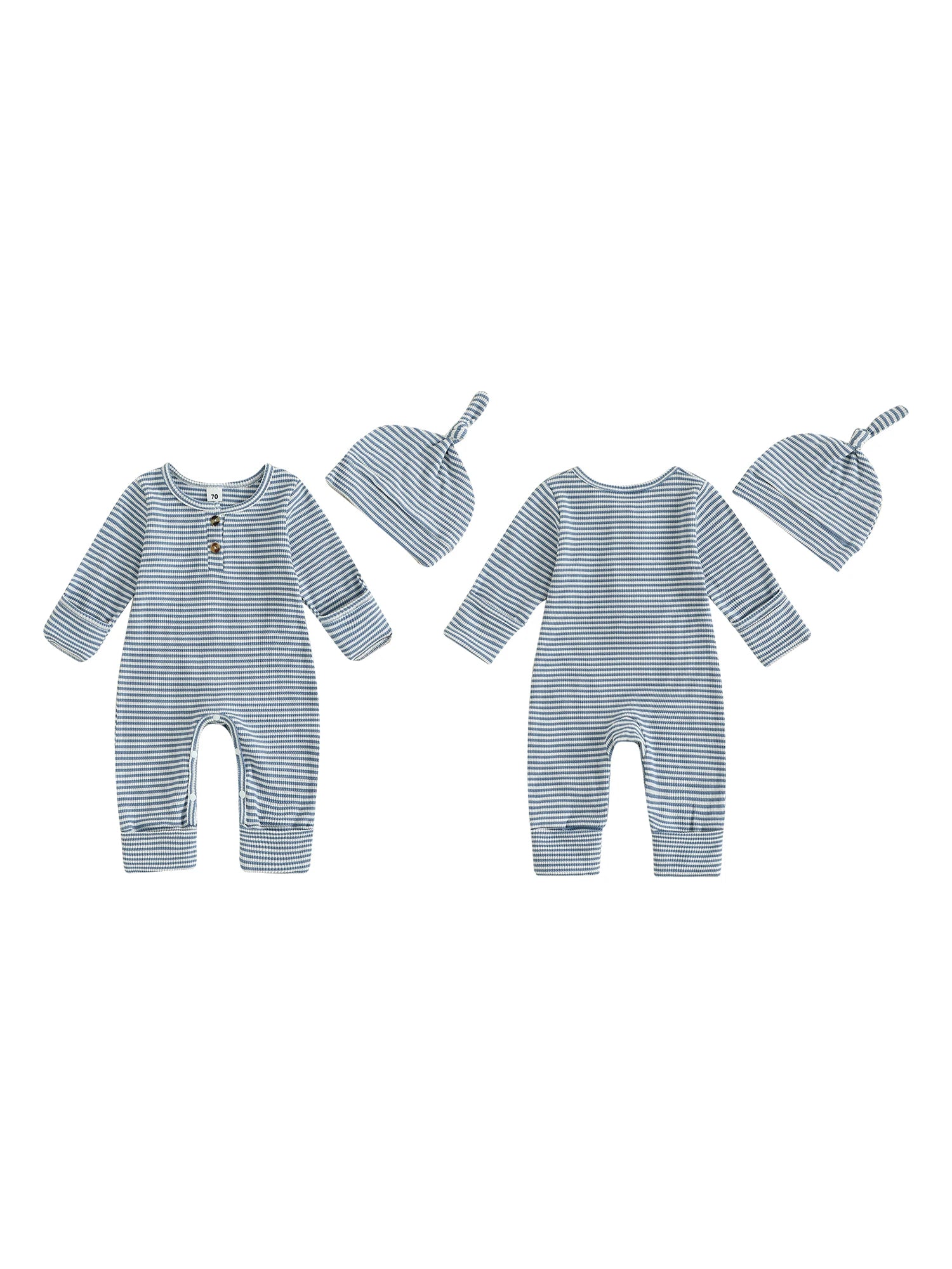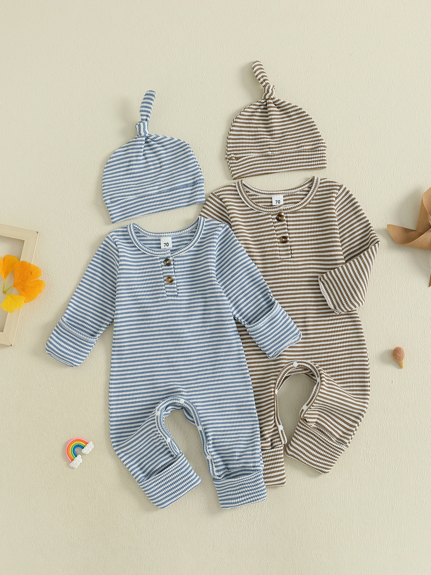 Infant Baby Fall Clothes Romper Stripe Print Long Sleeve Round Neck Full Length Jumpsuit with Hat 2 Pcs Set
